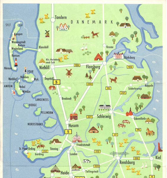 117,000 copies of a rather similar map were printed in 1961 under the colourful title of the Green Road to the Blue Sea (Die Grüne Straße am Blauen Meer. This showed a route from the Kattegat at the Northern tip of Denmark to Hamburg. The reverse side was given over to short descriptions in German (and a thumbnail drawing of each) of 34 places of interest that were along the road. The map was credited to "H.M.D." (see also below) and also included a small map of the Southern North Sea. |